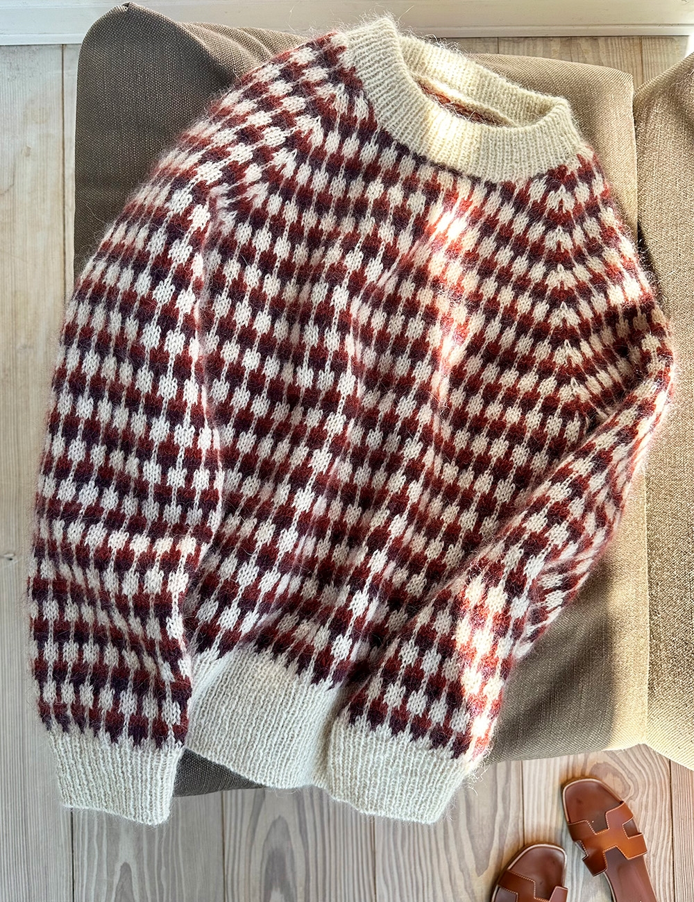 Facet Sweater ist ein Raglanpullover mit kleinem, grafischen Muster. Dieses besteht aus drei Farben; jedoch wird immer nur mit einem Faden gleichzeitig gestrickt und da die Spannfäden kurz sind, ist der Pulli leicht zu arbeiten. Da nicht viel Garn für die Musterfarben benötigt wird, ist der Facet Sweater ein ideales Projekt für Garnreste. Du kannst auch mit dem Muster ”spielen” und mehr als zwei Musterfarben verwenden.