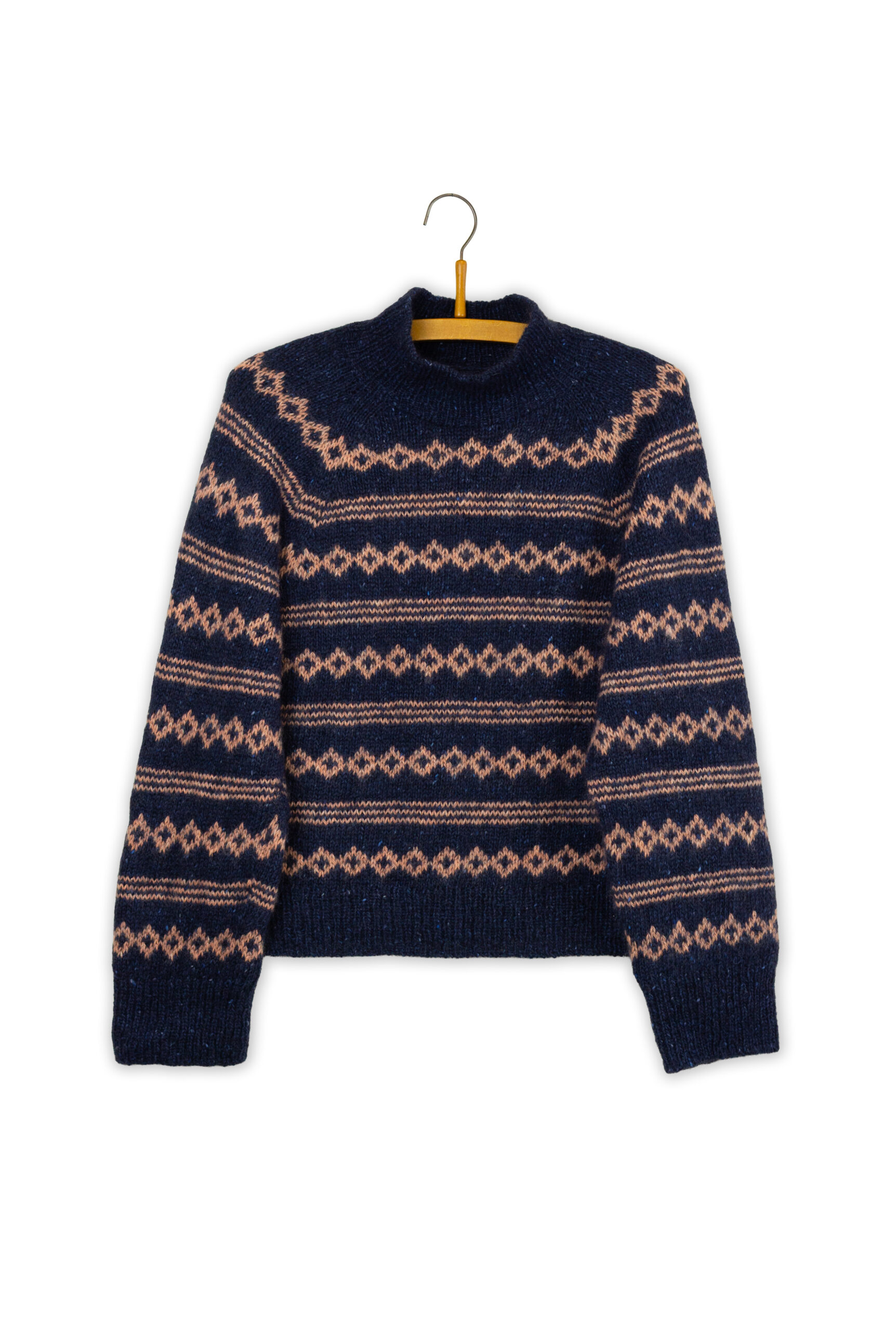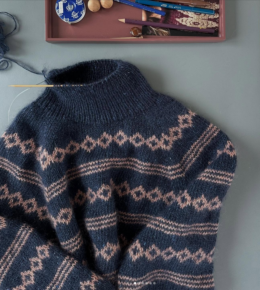 Der Mikala Sweater ist inspiriert von den grafischen Strickmustern der 1990er Jahre, aber auch stark von der traditionellen Fischerstrickjacke, deren Wurzeln noch weiter zurückreichen. Der Mikala Sweater hat einen Raglanschnitt und ein abwechslungs-reiches Muster, das einfach zu stricken ist, da das Muster nur in den Hinreihen erfolgt.