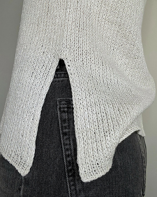 Das Chantal Top wird von oben nach unten gestrickt. Du beginnst an der Rückseite mit zwei Teilen, die nach dem Halsausschnit verbunden werden, danach werden die Vorderteile angestrickt. Nach dem Anfertigen des Halsausschnittes und wenn bis zu den Enden der Armausschnitte gestrickt wurde, geht es in der Runde weiter, bis zu den Schlitzen. Hier wird wieder in Reihen hin und her gestrickt.