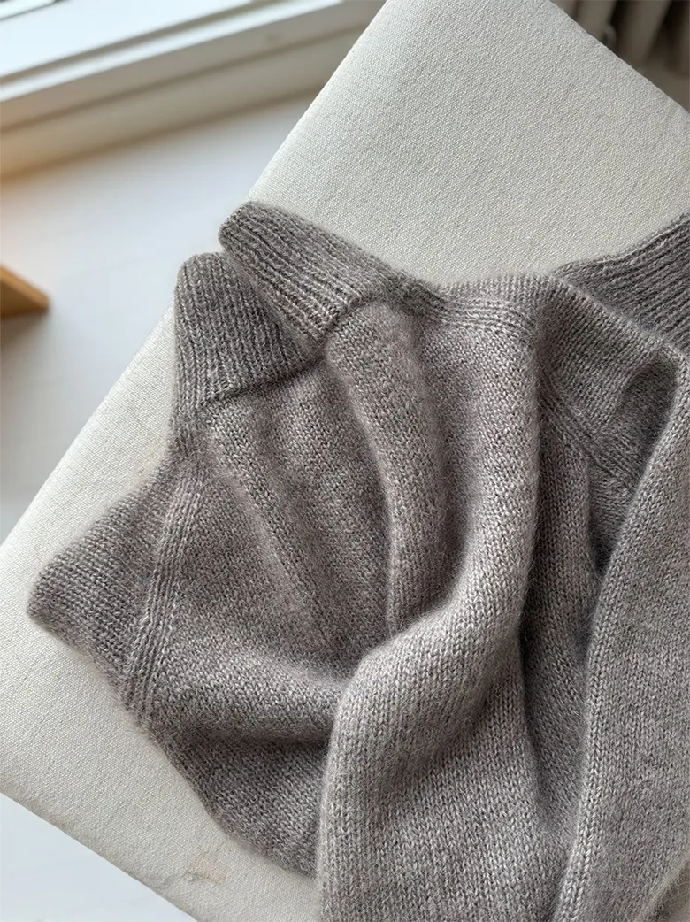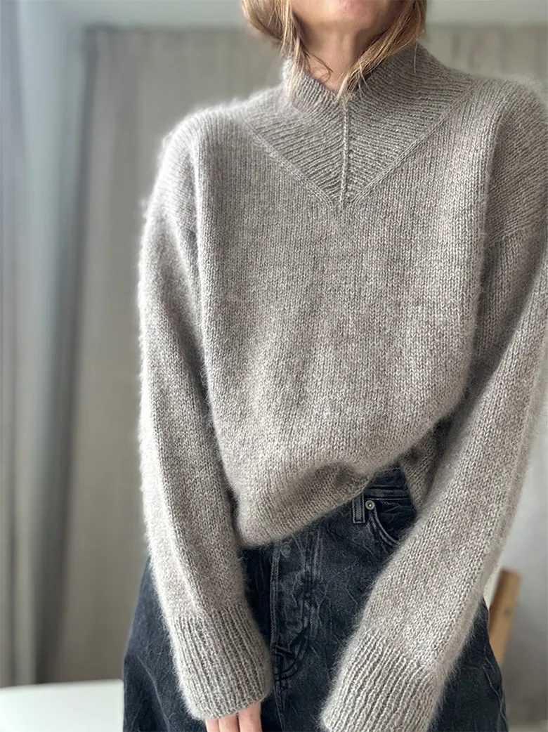 Der Pullover in der Anleitung wurde aus 1 Faden Spinni in Fb. 13s zusammen mit 2 Fäden Silk Mohair in Fb. E 3s von Isager gestrickt.