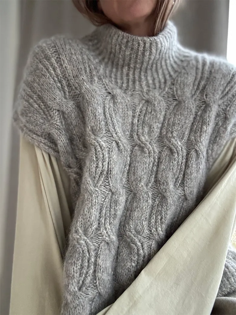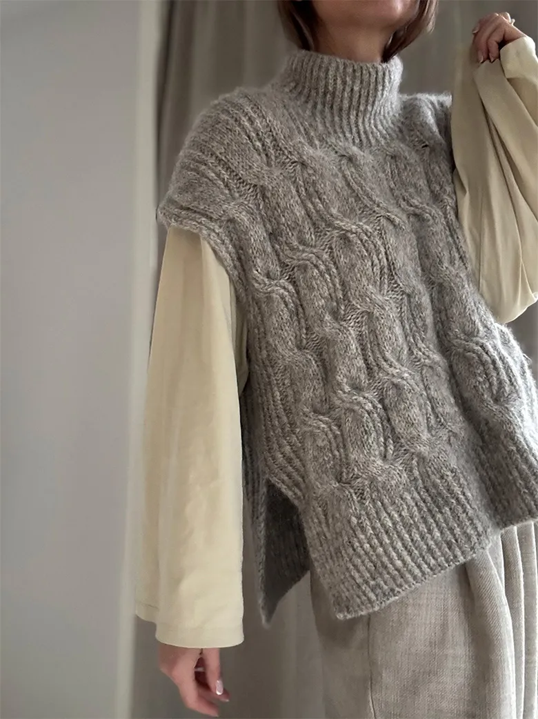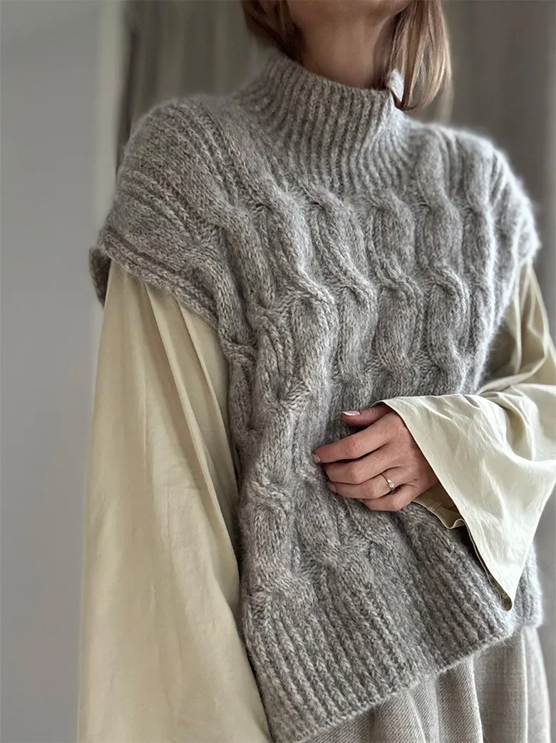 Der Pullunder wird von oben nach unten gearbeitet. Zuerst erfolgen Vorder- und Rückseite in Reihen. Danach werden beide Teile zum Rumpf verbunden, der in Runden gestrickt wird. Um eine gute Passform zu garantieren, erfolgen oben an der Rückseite, sowie an beiden Schultern verkürzte Reihen. Am Rumpf werden Zopfmuster und Segmente im verschränkten Rippenmuster entlang der Seiten vorgenommen. Zum Ende hin wird der Rumpf erneut geteilt und in Reihen fertiggestellt, so dass die seitlichen Schlitze entstehen. Vorder- und Rückseite werden mit Rändern im verschränkten Rippenmuster beendet und italienisch abgekettet. Rund um den Halsausschnitt werden Maschen für ein Bündchen aufgenommen, das ebenfalls im verschränkten Rippenmuster gestrickt und italienisch abgekettet wird.