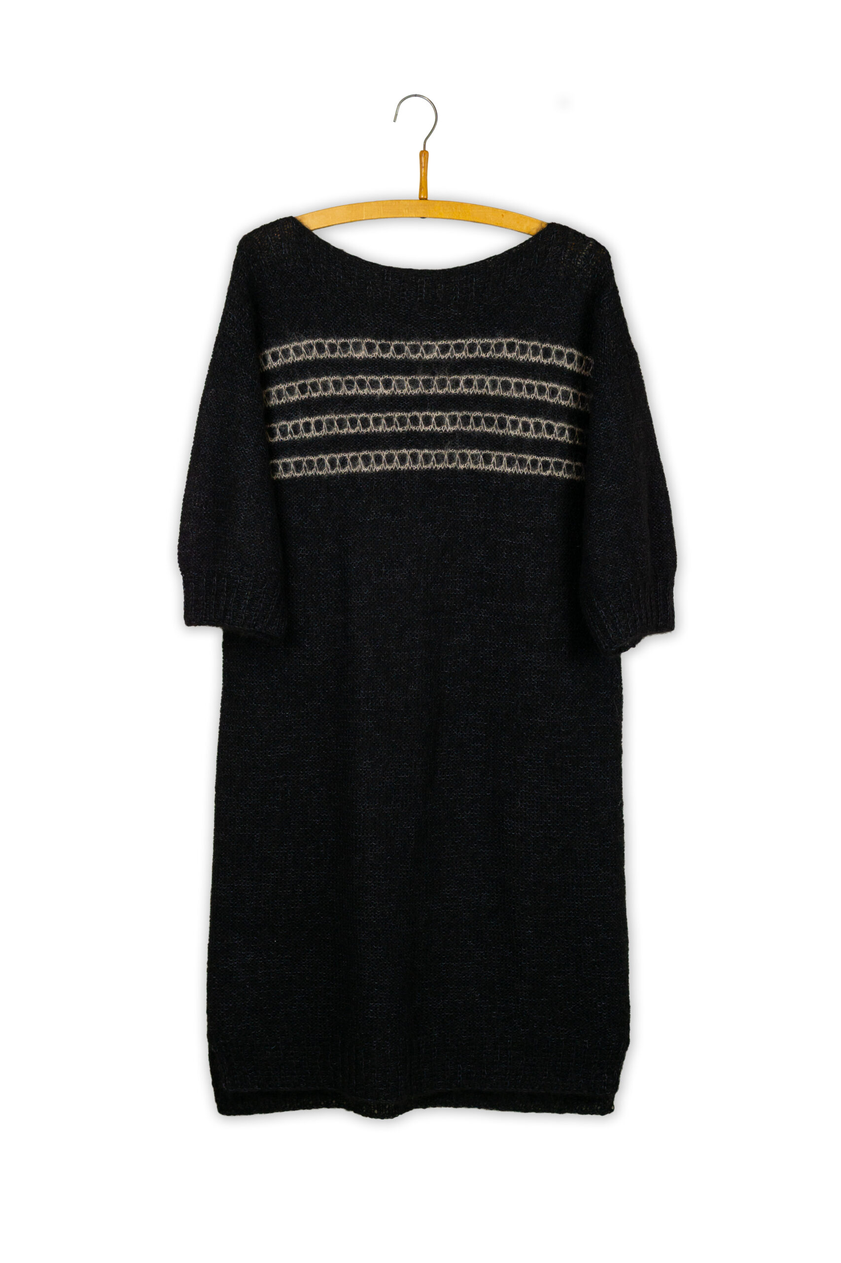 Die Länge des Kleides ist so berechnet, dass es knapp das Knie bedeckt. Die Ärmel sind auf eine 3/4-Länge ausgelegt. Das Kleid wird von oben nach unten gestrickt, wodurch sich alle Längen leicht individuell anpassen lassen.