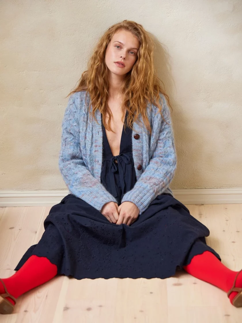 Zunächst werden Quadrate gehäkelt und zu einem Pullover zusammengenäht, gehäkelt aus Tynn Peer Gynt und Tynn Silk Mohair. Weiter werden Maschen für Bündchen rund um Vorder- und Rückenteil, um die Ärmel, entlang der Vorderleisten aufgestrickt. Die Halskante wird zum Schluss gestrickt. Die ganze Jacke wird mit 1 Faden jeder Qualität gehäkelt und gestrickt.
