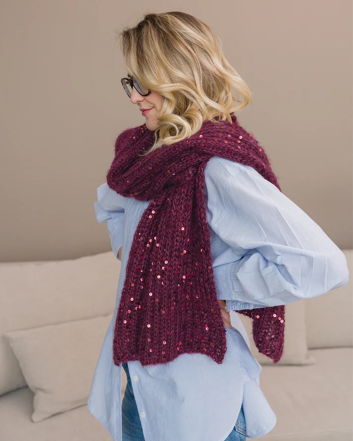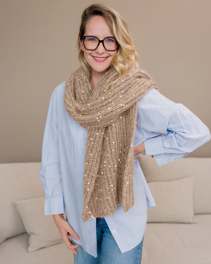 Der EmiScarf von Sinchens Knitwear ist “eigentlich” ein schlichter und einfach gestrickter Schal im Patentmuster. Aber. DAS Paillettengarn.