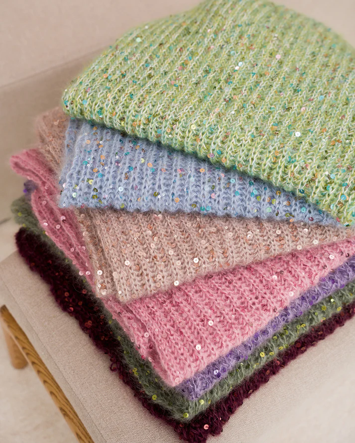 Zum Paillettengarn kombinierst du 2 Fäden Mohair, sodass er superflauschig und voluminäs wird.