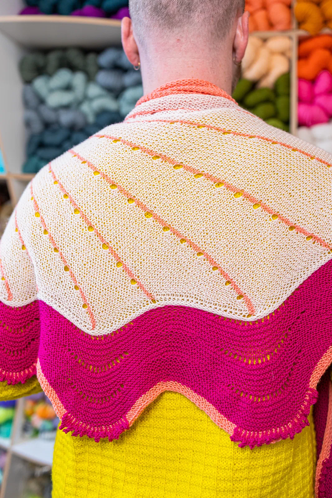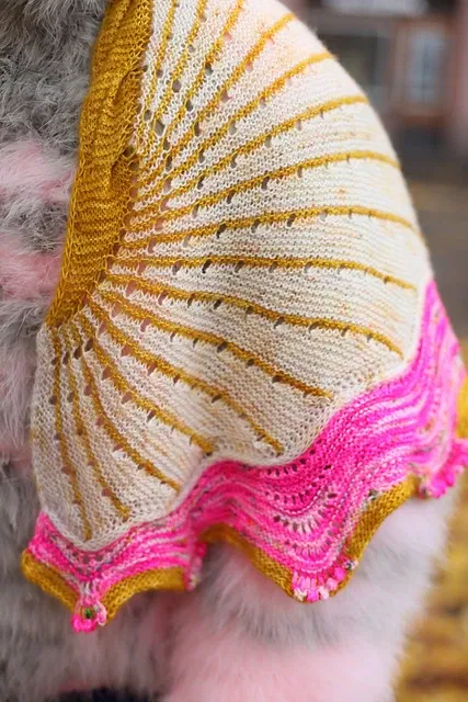 Dies war der Mystery Knit Along-Schal aus dem Jahr 2015. Wähle drei Farben, um diesen verspielten Schal zu stricken. Beginne mit Westknits-short-cut-rows und nimm zu, um den gestreiften Abschnitt zu stricken. Fahre mit einer Kontrastfarbe fort, um ein großes Zopfmuster zu stricken, das sich über die Kante erstreckt. Nimm Maschen in einer dritten Farbe auf, um die gewellte Bordüre zu stricken. Wähle zwischen einem einfachen I-Cord-Abketten oder füge dekorative Picot-Cluster für eine verzierte Kante hinzu.